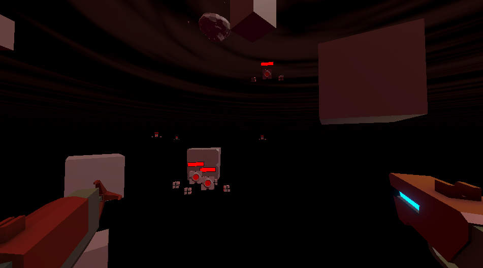 You are going to encounter enemies - the floating robots that will chase you and shoot at you. Shoot back!